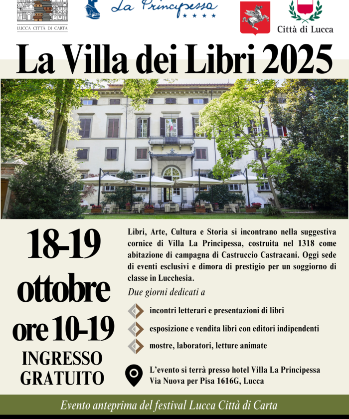“La Villa dei Libri” è un evento organizzato da Lucca Città di Carta APS, in collaborazione con Hotel Villa La Principessa, Nati per scrivere e L’Ordinario. Partner dell’iniziativa: libreria “Fuori Porta”, libreria “La storia infinita”. Patrocinio del Comune di Lucca e della Regione Toscana.