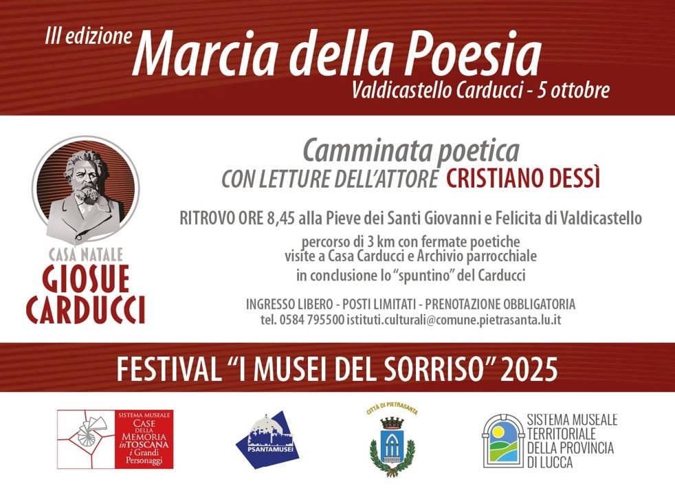 Lucca, 2 ottobre 2025 – La “Marcia della Poesia. Poesie in cammino” a Pietrasanta, con letture di Cristiano Dessì, questa settimana nel calendario del quarto festival “I Musei del Sorriso”, organizzato dal Sistema Museale Territoriale della Provincia di Lucca in collaborazione con Fondazione Toscana Spettacolo Onlus e con il sostegno della Fondazione Cassa di Risparmio di Lucca.