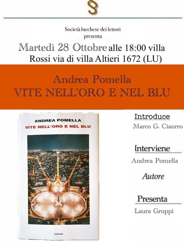 “Vite nell’oro e nel blu”: il romanzo Einaudi di Andrea Pomella selezionato per la 39sima edizione del Premio dei Lettori Lucca-Roma. L’autore sarà ospite della Società Lucchese dei Lettori a Villa Rossi (Gattaiola-Lucca) martedì 28 ottobre alle 18 grazie al sostegno della Fondazione della Cassa di Risparmio di Lucca e della Fondazione Banca del Monte di Lucca.
