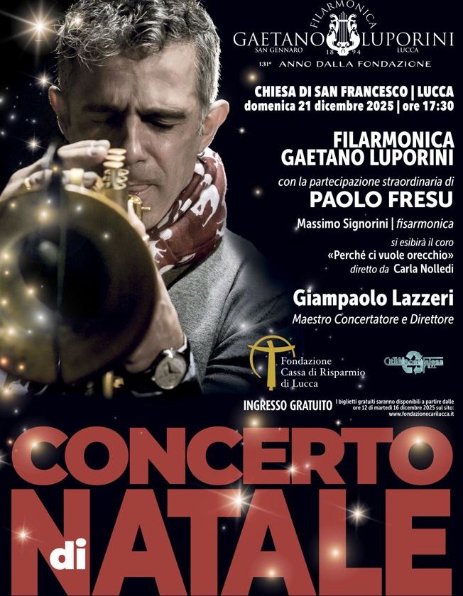 Domenica 21 dicembre 2025, alle ore 17.30, la Chiesa di San Francesco, a Lucca, ospiterà il consueto e tradizionale Concerto di Natale della Filarmonica “Gaetano Luporini” di San Gennaro, diretta dal M° Giampaolo Lazzeri, al suo 25esimo anno di guida artistica e musicale della storica formazione lucchese.