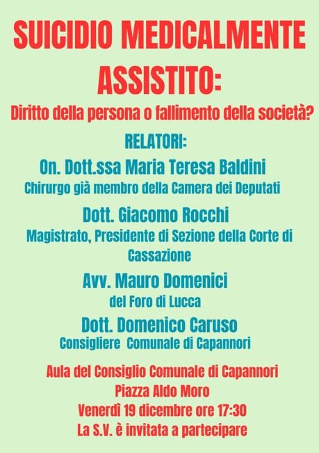 La complessa e controversa questione del suicidio medicalmente assistito sarà al centro di un convegno pubblico dal titolo "Suicidio medicalmente assistito: diritto della persona o fallimento della società?". L'evento si terrà nell’aula del Consiglio Comunale di Capannori in Piazza Aldo Moro il prossimo 19 dicembre alle ore 17:30 e avrà come relatori la Dott.ssa Maria Teresa Baldini, chirurgo già membro della Camera dei Deputati, il Dott. Giacomo Rocchi magistrato, Presidente di Sezione della Corte di Cassazione, l’Avv. Mauro Domenici del foro di Lucca e il Dott. Domenico Caruso consigliere comunale di Capannori.