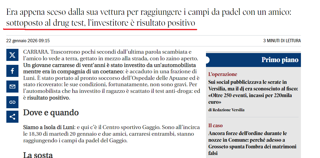 Viva la libertà di drogarsi, un ventenne è stato investito da un positivo al drug test. Perché i drogati non fanno del male solo a sé stessi.