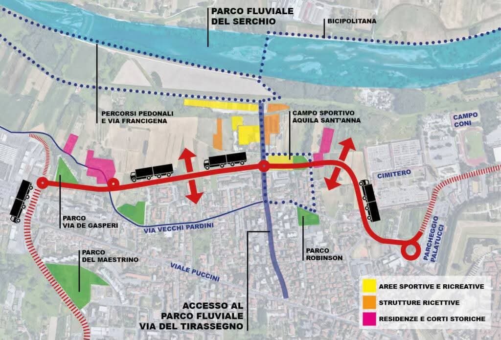- ci sono delle zone urbanizzate, prima tra tutto il tratto finale prima della rotonda su Viale Puccini che non consentono la realizzazione di una strada larga adatta al passaggio di TIR.