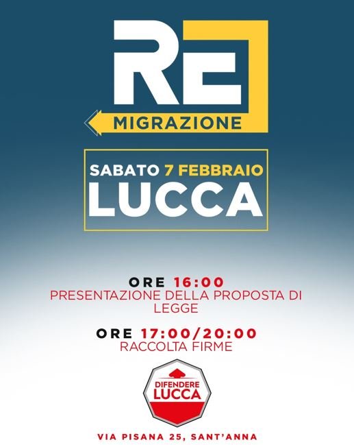 Lucca, 6 febbraio — È confermata per sabato 7 febbraio alle ore 16 la presentazione della proposta di legge sulla Remigrazione, presso la sede del movimento Difendere Lucca, in via Pisana 25 a Sant’Anna.