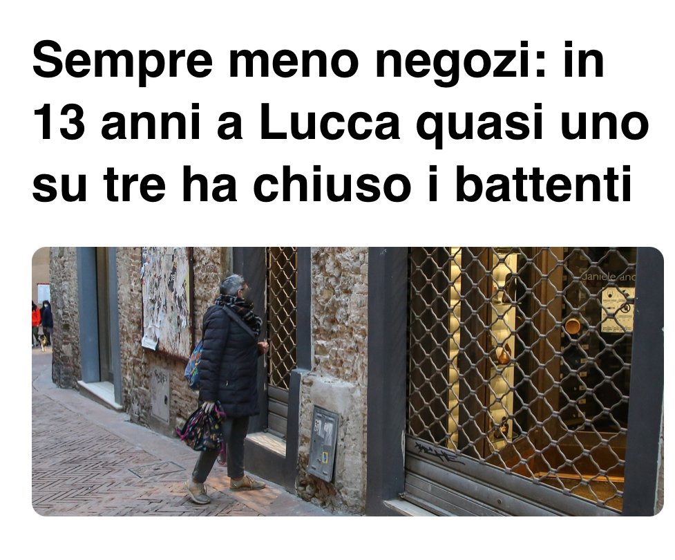 Io dati dicono chiaro che 1 negozio su 3 negli ultimi anni ha chiuso . Basta infatti guardare come via san paolino molte attività. Siano chiuse con fondi vuoti e altre abbiano il cartello di vendita dell attività. vedere come attività storiche di piazza San Michele sono state rimpiazzate da mangiatoie. E allora mi è vi chiedo. A fronte comunque di un incremento della popolazione ( +1.5% ) cosa può fare una città affinché le attività possano sopravvivere di questi tempi e evitare che Lucca non sia l ennesima città mangiatoia ?