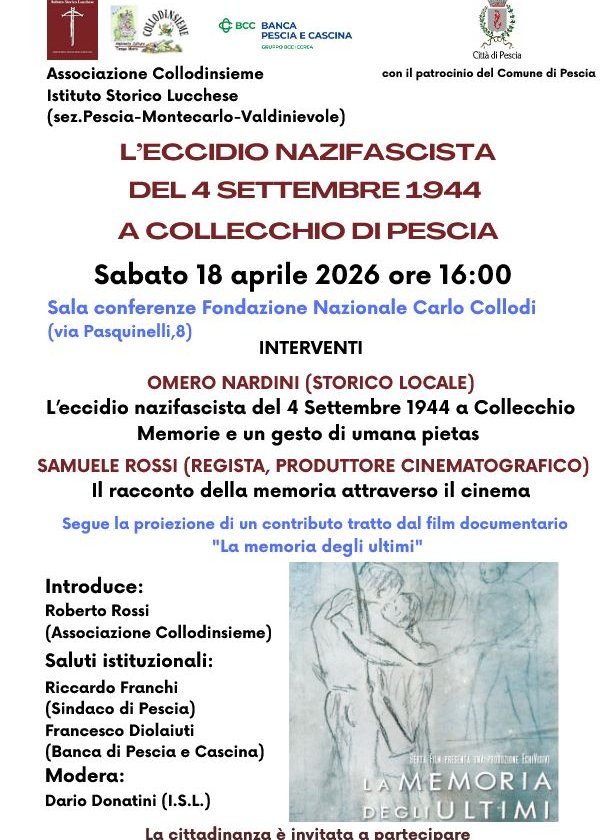 Sabato 18 aprile 2026, ore 16:00, nella sala conferenze della Fondazione Nazionale Carlo Collodi (Collodi, via Pasquinelli, 8) si terrà un incontro pubblico sull’eccidio nazifascista di Collecchio di Pescia, organizzato dall’Associazione Collodinsieme e dall’Istituto Storico Lucchese (sez. Pescia-Montecarlo-Valdinievole) con il patrocinio del Comune di Pescia. Il socio dell’I.S.L. Omero Nardini terrà una conferenza sul tema L’eccidio nazifascista del 4 settembre 1944 a Collecchio. Memorie e un gesto di umana pietas. Seguirà l’intervento di Samuele Rossi, regista pesciatino e produttore cinematografico, sul tema Il racconto della memoria attraverso il cinema, con la proiezione di un contributo tratto dal suo film documentario “La memoria degli ultimi”. L’incontro sarà moderato da Dario Donatini, direttore della Sezione I.S.L., e introdotto da Roberto Rossi di Collodinsieme. Porteranno saluti istituzionali Riccardo Franchi, Sindaco di Pescia e Francesco Diolaiuti, direttore della Banca di Pescia e Cascina.