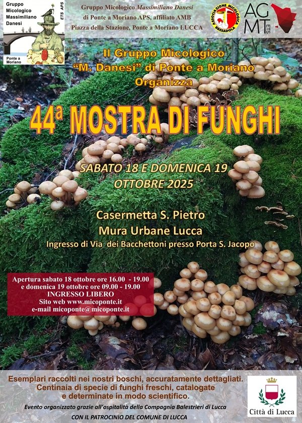 Il Gruppo Micologico "Massimiliano Danesi" di Ponte a Moriano informa dell'evento che si terrà in questo fine settimana (18-19 ottobre) presso le mura urbane di Lucca, Casermetta S. Pietro ingresso da via dei Bacchettoni, dal titolo: "44a mostra di funghi". La sede, ottenuta grazie alla Compagnia Balestrieri di Lucca ospitando nei sotterranei della Casermetta stessa, un ambiente nuovo e sfidante dal punto organizzativo per l'allestimento, ma al contempo inserito in un bellissimo e frequentato contesto urbano. L'iniziativa, sotto il Patrocinio del Comune di Lucca, inizierà con l'allestimento il sabato 18 ottobre di mattina e sarà già possibile portare i funghi raccolti per essere determinati ed esposti. L'inaugurazione della mostra al pubblico sarà sempre sabato alle ore 16 e potranno proseguire le visite fino alle ore 19, per riprendere la domenica successiva 19 ottobre dalle ore 9 alle ore 19.