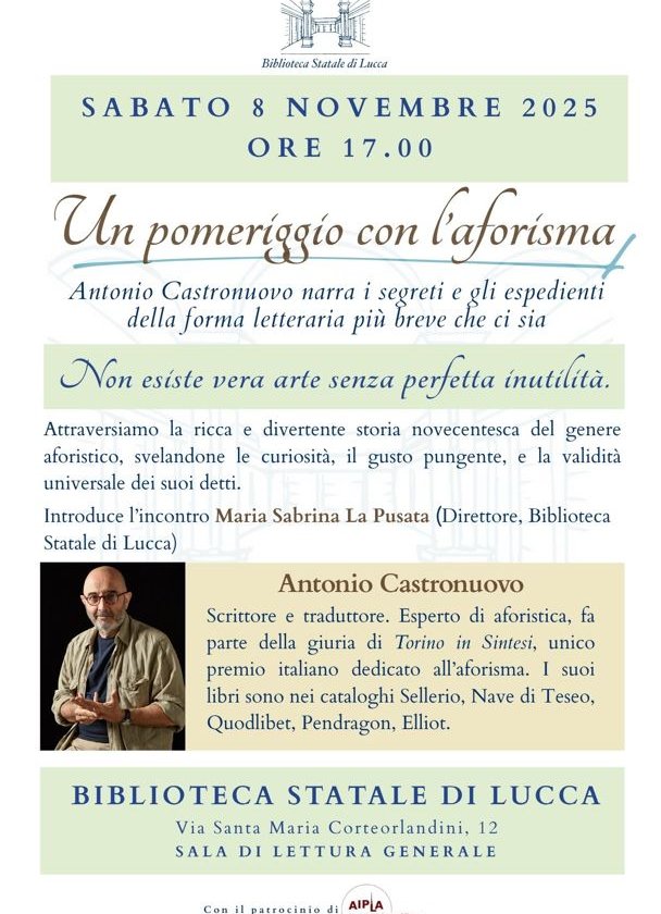 Sabato 8 novembre dalle ore 17.00 alle ore 18.30 presso il Salone di Lettura Generale della Biblioteca Statale di Lucca si terrà l’evento Un pomeriggio con l’aforisma.