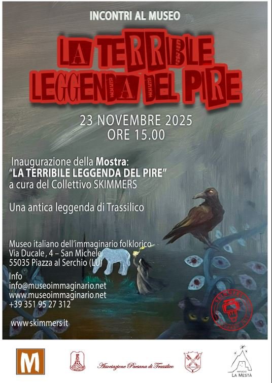 Nell’ambito degli appuntamenti pomeridiani Incontri al Museo, domenica 23 novembre alle ore 15.00 il Museo Italiano dell’Immaginario Folklorico ospiterà la mostra La terribile leggenda del Pire del Collettivo artistico Skimmers. Il pomeriggio, con la partecipazione degli amministratori locali, dell’Associazione Paesana di Trassilico e di Italo Pierotti, vuole accendere una piccola luce sulle problematiche delle aree interne, che corrono il rischio di scomparire senza una adeguata progettazione che miri a preservare e valorizzare il loro ricco patrimonio culturale e paesaggistico.