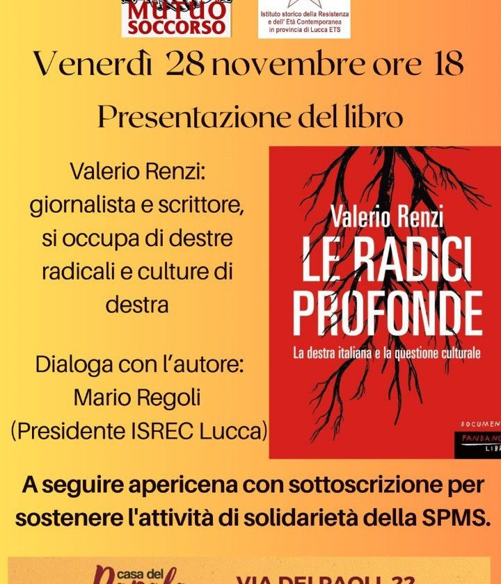 Non solo la conquista del potere, ma anche dell’anima stessa del Paese. Uno dei fantasmi che si aggirano nel dibattito pubblico italiano ha a che fare con la rivendicata volontà da parte della destra politica, erede del neofascismo, di costruire una propria «egemonia culturale» ("Il manifesto", 5 giugno 2025) Succede anche a Lucca, da quando i "fascisti del terzo millennio" fanno parte della Giunta comunale e amministrano la città. Ne parliamo il 28 novembre alle 18, nel corso della presentazione del libro "Le radici profonde. La destra italiana e la questione culturale". L'autore: Valerio Renzi, giornalista, capo area della cronaca romana di Fanpage.it, da anni si occupa di culture di destra e neofascismi. Per i tipi di Edizione Alegre ha scritto "La politica della ruspa. La Lega di Salvini e le nuove destre europee" (2015), e per Fandango Libri "Fascismo Mainstream" (2021). https://www.facebook.com/CdPLucca