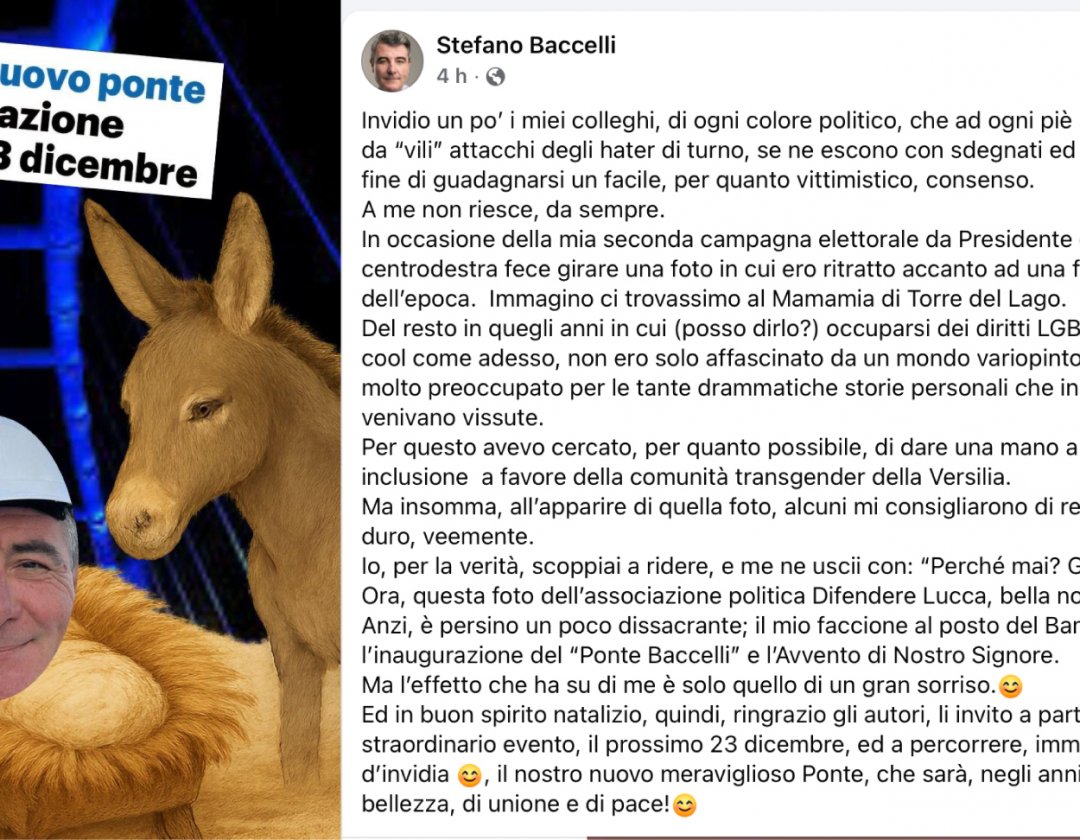 Stefano Baccelli non si offende, anzi sì. Il meme di Difendere Lucca che lo ritrae ‘Bambin Gesù’, in riferimento alla nascita del nuovo ponte sul Serchio che verrà inaugurato per la seconda volta il 23 dicembre, colpisce nel segno. La replica social dell’ex consigliere regionale è una contraddizione perfetta: dice di non offendersi, ma si offende, di non fare la vittima ma la fa. Usando per difesa un episodio del tutto sconnesso: una foto che il centrodestra avrebbe fatto girare anni fa, di lui a Torre del Lago con dei trans. La carta della sensibilità Lgbtq+ è di solito l’asso di briscola nel mondo progressista, e il fatto che Baccelli lo cali è indicativo. Il suo elettorato più di sinistra plaude (e ringhia), ma qualcuno del suo pubblico democristiano potrebbe trovare più dissacrante questo accostamento al Natale, rispetto al fotomontaggio di Difendere Lucca.