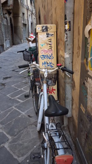Corte delle Uova lasciata in balia di scritte varie bici arrugginite.. pattume vario e li c'e' gente che magna la pizza in mezzo alla strada vicina - sotto la Chiesa senza rispetto dei santi - a masticare come se non mangiassero da una vita colle cagate dei piccioni pure ma via ma che fanno i vigili o gli addetti al decoro....................