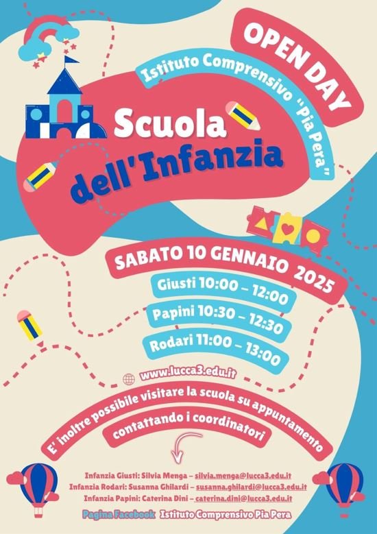 Per ulteriori informazioni è possibile consultare il sito dell’istituto: https://www.lucca3.edu.it/open-day-e-visite-guidate-alle-scuole-dellinfanzia/