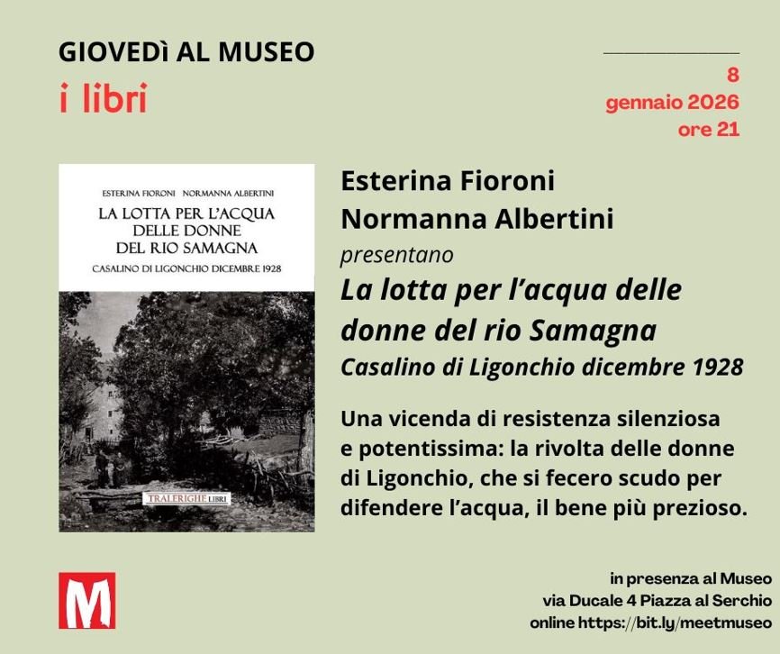 Una storia dentro la Storia, una vicenda di resistenza silenziosa e potentissima quella delle donne di Ligonchio, che si fecero scudo per difendere l’acqua, il bene più prezioso: con la presentazione del libro La lotta per l’acqua delle donne del rio Samagna. Casalino di Ligonchio dicembre 1928 (Tralerighe libri, 2025), ospiti le autrici Esterina Fioroni e Normanna Albertini, riprendono l’8 gennaio alle ore 21 gli appuntamenti dei Giovedì al Museo.