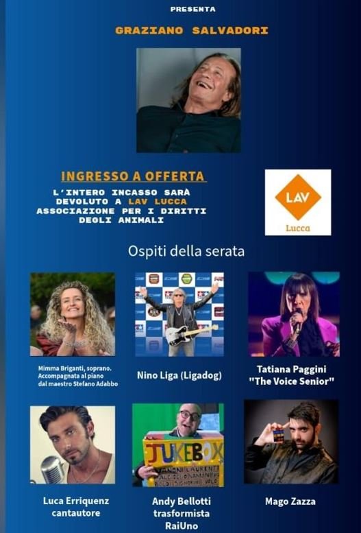 L’iniziativa, che è organizzata da “Ga&Ga” a cura del direttore artistico Alessandro Galli e Lav Lucca con il patrocinio del Comune Città di Lucca e Vivi Lucca, vedrà salire sul palco nella veste di presentatore il comico cabarettista Graziano Salvadori, mentre gli ospiti della serata saranno: Mimma Briganti (soprano) accompagnata da Stefano Adabbo; Nino Liga (Ligadog); Tatiana Paggini (“The Voice Senior”); Luca Erriquenz (cantautore); Andy Bellotti (trasformista RaiUno) e Mago Zazza.