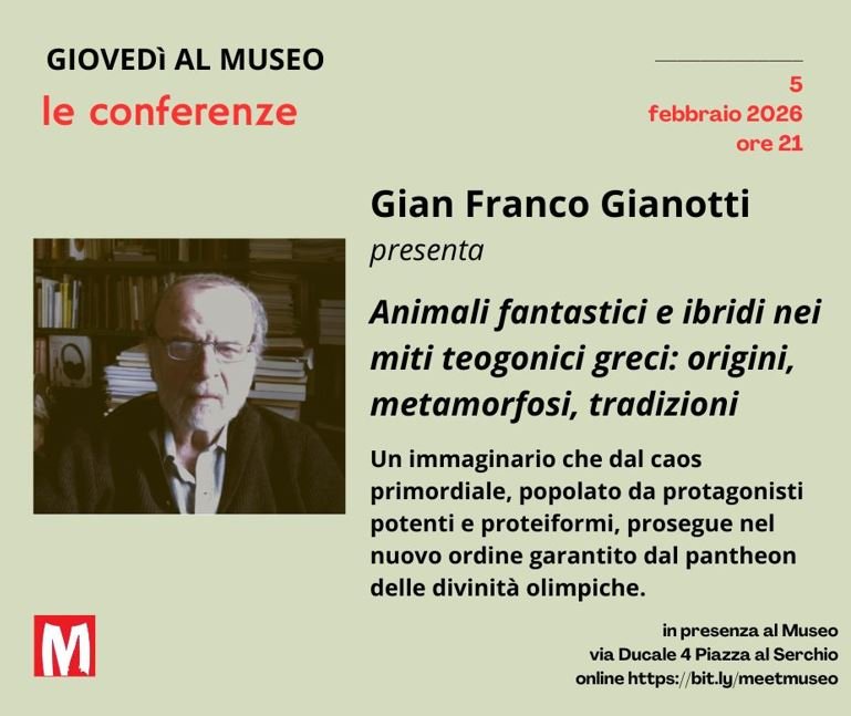Un viaggio nel mondo classico insieme al Professor Gian Franco Gianotti con la conferenza Animali fantastici e ibridi nei miti teogonici greci: origini, metamorfosi, tradizioni è quanto propone l’appuntamento del 5 febbraio alle ore 21 per i Giovedì al Museo. È possibile assistere all’incontro unicamente online, prenotandosi al link: https://bit.ly/febbraio26; si rilascia l’attestato di partecipazione su richiesta.