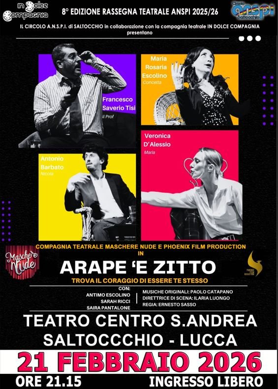 Sabato 21/02/26 alle ore 21.15 presso il teatro del Centro S.Andrea di Saltocchio (LU) si terrà il sesto appuntamento dell'8° edizione dell'annuale Rassegna Teatrale Toscana Anspi 2025/2026 organizzata dal Circolo Anspi Saltocchio in collaborazione con la compagnia teatrale In Dolce Compagnia e riservata alle compagnia teatrali amatoriali.