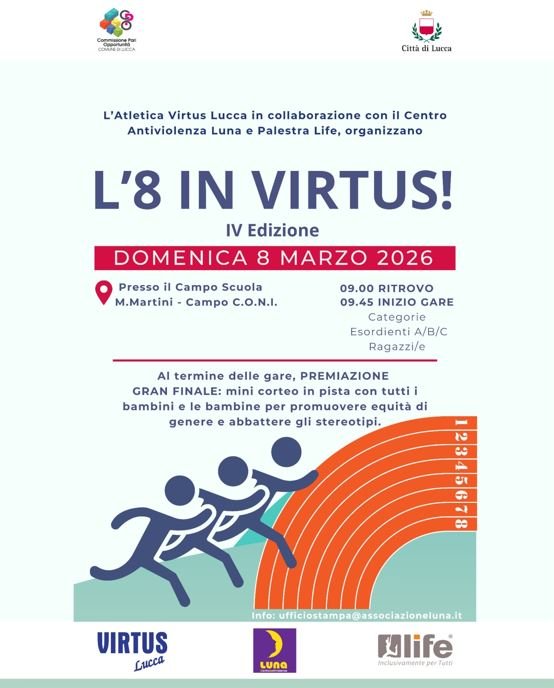 L’Atletica Virtus Lucca, da oltre cinquanta anni in pista per i giovani, per la loro crescita in un contesto sano in cui i valori e il senso del rispetto reciproco siano alla base del quotidiano, è fiera della collaborazione con due realtà come il Centro Antiviolenza Luna e Life, con le quali condivide l’idea che lo sport possa e debba essere veicolo di messaggi importanti contro ogni forma di violenza o di discriminazione. L’evento “L’8 in Virtus” racchiude la forza dell’unione di intenti e l’impegno comune per un modello di coscienza collettiva improntato sulla cultura dell’equità.