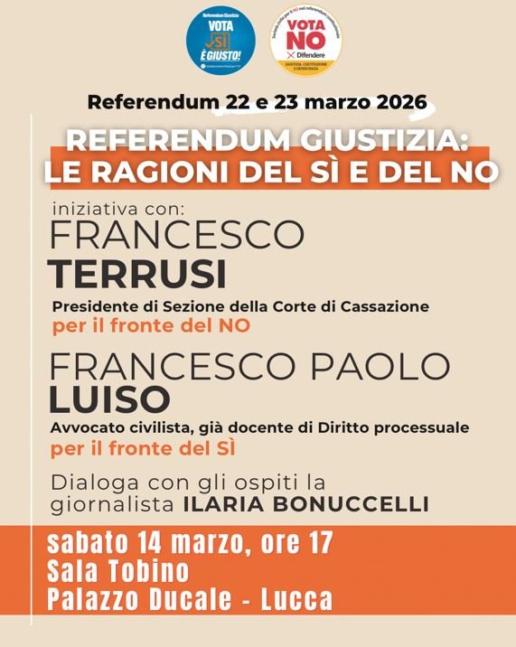 il 22 e 23 marzo 2026. È questo l’obiettivo dell’incontro dal titolo “Referendum Giustizia: le ragioni del Sì e del No”, che si terrà sabato 14 marzo alle 17 nella Sala Tobino di Palazzo Ducale a Lucca.
