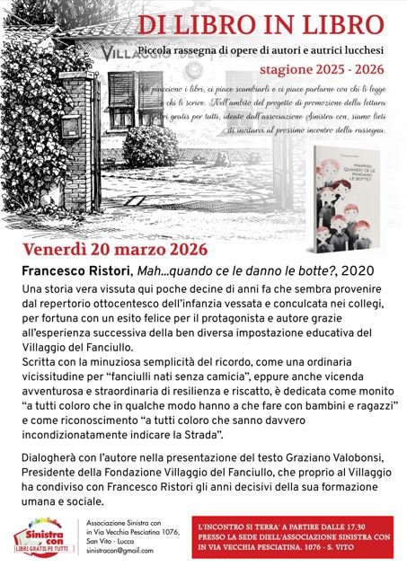 Sarà presentato Mah… quando ce le danno le botte?, un testo pubblicato nel 2020 in cui Francesco Ristori ha raccolto i ricordi dell’accidentato percorso di formazione che ha condiviso col fratello Marco, dalla prima infanzia modesta ma felice nella Diecimo negli anni Cinquanta alle prevaricazioni subite in un collegio della Versilia nel periodo delle scuole elementari fino agli anni di rinascita e fioritura nel ben diverso ambiente educativo del Villaggio del Fanciullo di Lucca. Una vicissitudine di “fanciulli nati senza camicia”, per usare le parole dell’autore, che a tratti sembra provenire da un repertorio ottocentesco di storie di infanzia vessata e conculcata, ma che per fortuna è anche una vicenda avventurosa di resilienza e riscatto da cui c’è da imparare anche ora che nella nostra società la violenza verso i minori e la povertà educativa hanno preso altre forme. Scritto con la minuziosa semplicità della memoria che si vuole preservare, il libro è dedicato come monito “a tutti coloro che in qualche modo hanno a che fare con bambini e ragazzi” e come riconoscimento “a tutti coloro che sanno davvero incondizionatamente indicare la Strada”.