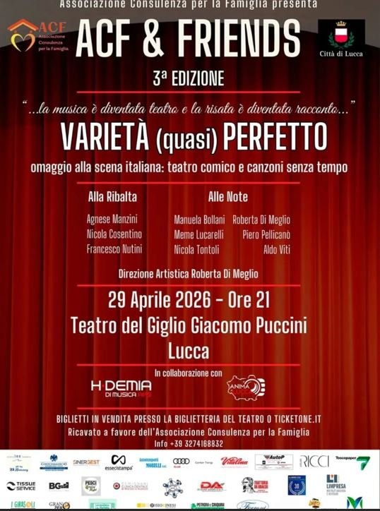 MERCOLEDI 29 APRILE ORE 21, PRESSO IL TEATRO DEL GIGLIO GIACOMO PUCCINI, CI SARA' LA TERZA EDIZIONE DI ACF & FRIENDS, EVENTO BENEFICO A FAVORE DELL'ASSOCIAZIONE CONSULENZA PER LA FAMIGLIA. ATTORI E MUSICISTI PROFESSIONISTI SI ESIBIRANNO SUL PALCO, A TITOLO GRATUITO, PER RACCOGLIERE FONDI PER SOSTENERE LE ATTIVITA' DELL'ACF. I BIGLIETTI SI POSSONO ACQUISTARE SIA SU TICKETONE CHE PRESSO LA BIGLIETTERIA DEL TEATRO. VI ASPETTIAMO NUMEROSI